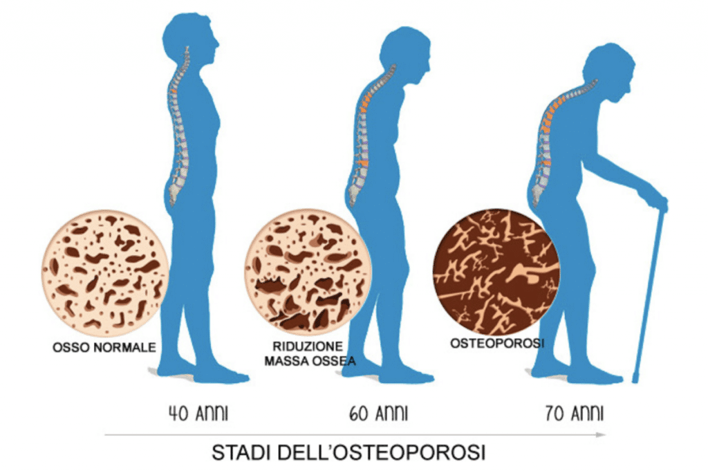 Secondo quanto riportato dal sito del Ministero della Salute, l’osteoporosi è una malattia sistemica dell’apparato scheletrico, caratterizzata da una riduzione della densità minerale e dal deterioramento della micro-architettura del tessuto osseo, che diventa più fragile e più esposto ad un rischio di fratture spontanee o per traumi di lieve entità. Le sedi che sono più frequentemente soggette a fratture sono il corpo vertebrale (soprattutto a livello della colonna dorso-lombare), il femore (a livello del collo o del trocantere) e l’estremo distale del radio.