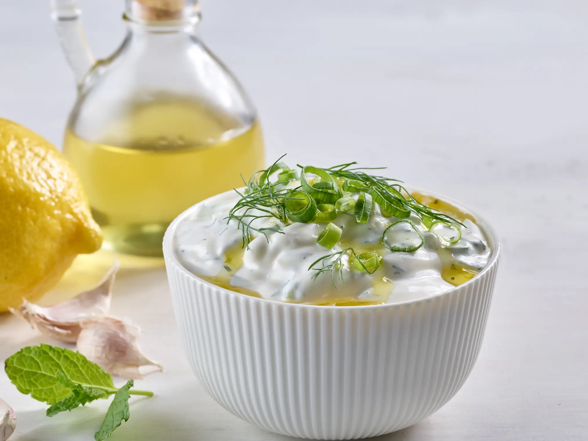 5. Versare lo yogurt greco in una ciotola, aggiungere un pizzico di sale, l'olio e una spruzzata di succo di limone e mescolare il tutto.