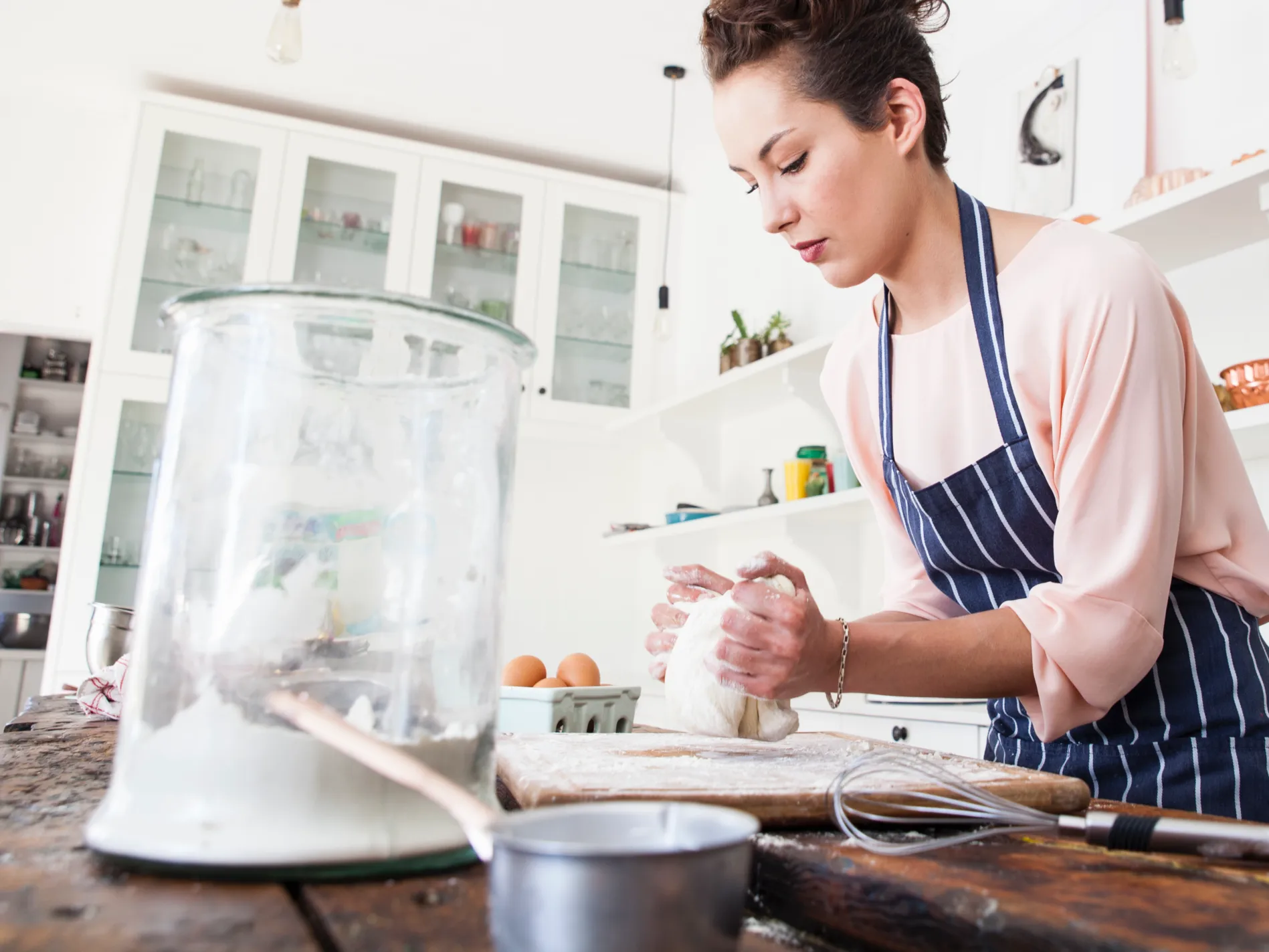 donna che impasta con acqua frizzante e bicarbonato per sostituire il lievito se si soffre di intolleranza al lievito